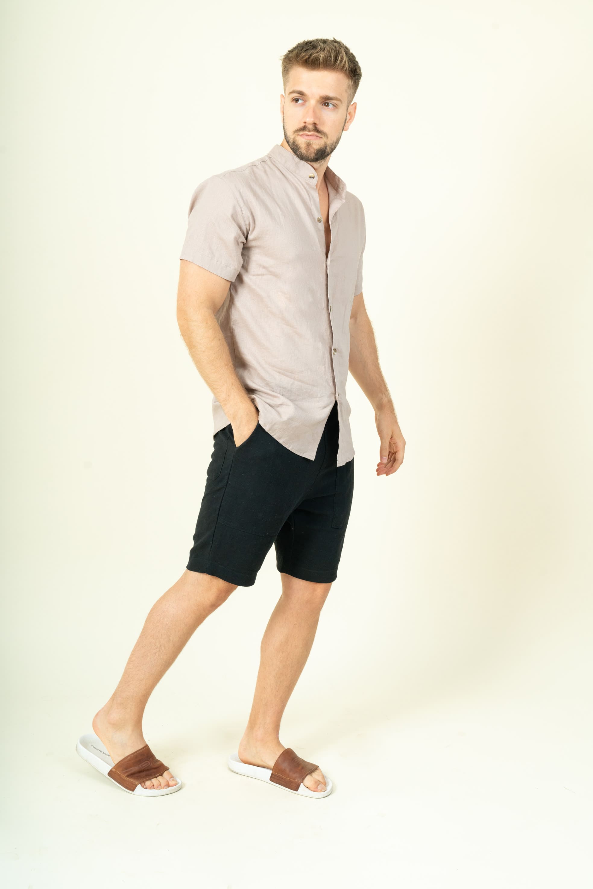 Beige Mens Linen Shirt Short Sleeves